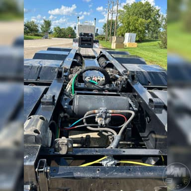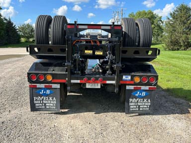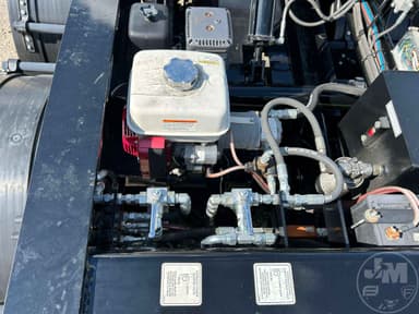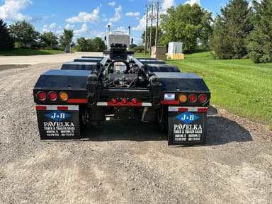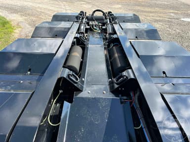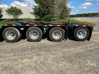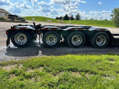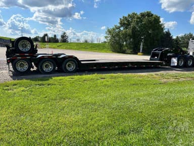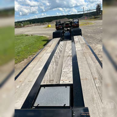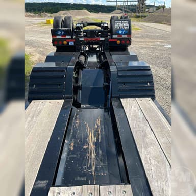 HYDRAULIC RGN LOWBOY TRAILER, 60 TON, TRI-AXLE, FLIP 4TH AXLE, DECK LENGTH 25', 8' WIDE, AIR RIDE SUSPENSION, WOOD DECKING, 255/70R22.5 TIRES, WITH RETRACTABLE 3RD & HYD. 4TH FLIP AXLES, OAL 53', 8'6' FLUSH WIDE, 116" SWING, 22" LOADED DECK HEIGHT, 26' CLEAR DECK, 54" AXLE SPACING, DUAL SOURCE HYD, POWER HONDA ENGINE OR TRACTOR PTO AT 15 GMP AND 3000 PSI, COLOR IS BLACK
