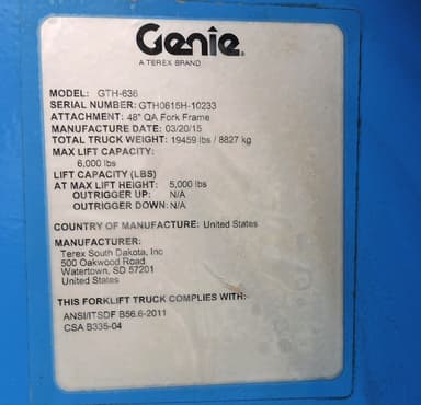 SUPER CLEAN 2015 GENIE GTH 636 REACH FORKLIFT — Powered By A 2.4 Liter Deutz Diesel Motor, All Wheel Drive, Front & All Wheel Steering, 36 ft Reach, 6,000 lb Lift Ability, Aux Hyd Hoses At End Of Stick, 48 Inch Forks, Recently Installed 13.00 – 28 NHS All Terrain Tires, New Seat With Folding Armrest, Dual Rear View Mirrors, Fenders, No Apparent Leaks, Dash Does Not Light Up – Paperwork Shows Low 2000 Hours, Ready To Work! ... ONLY $62,900 With Funding Available To Existing Businesses OAC